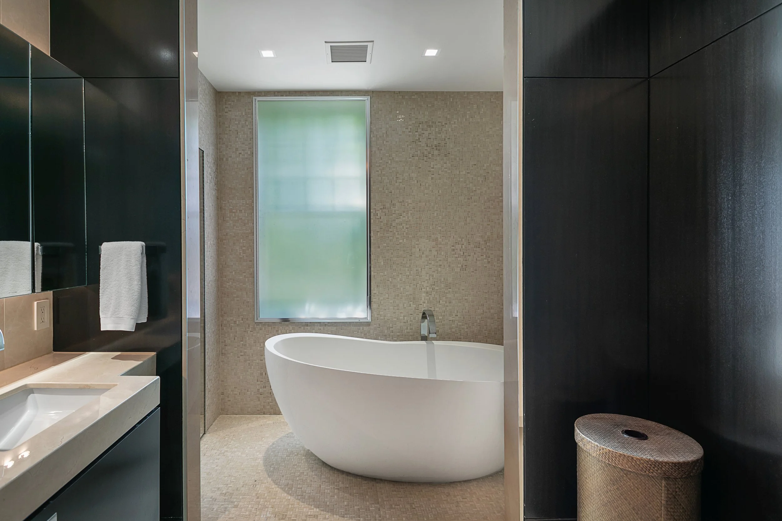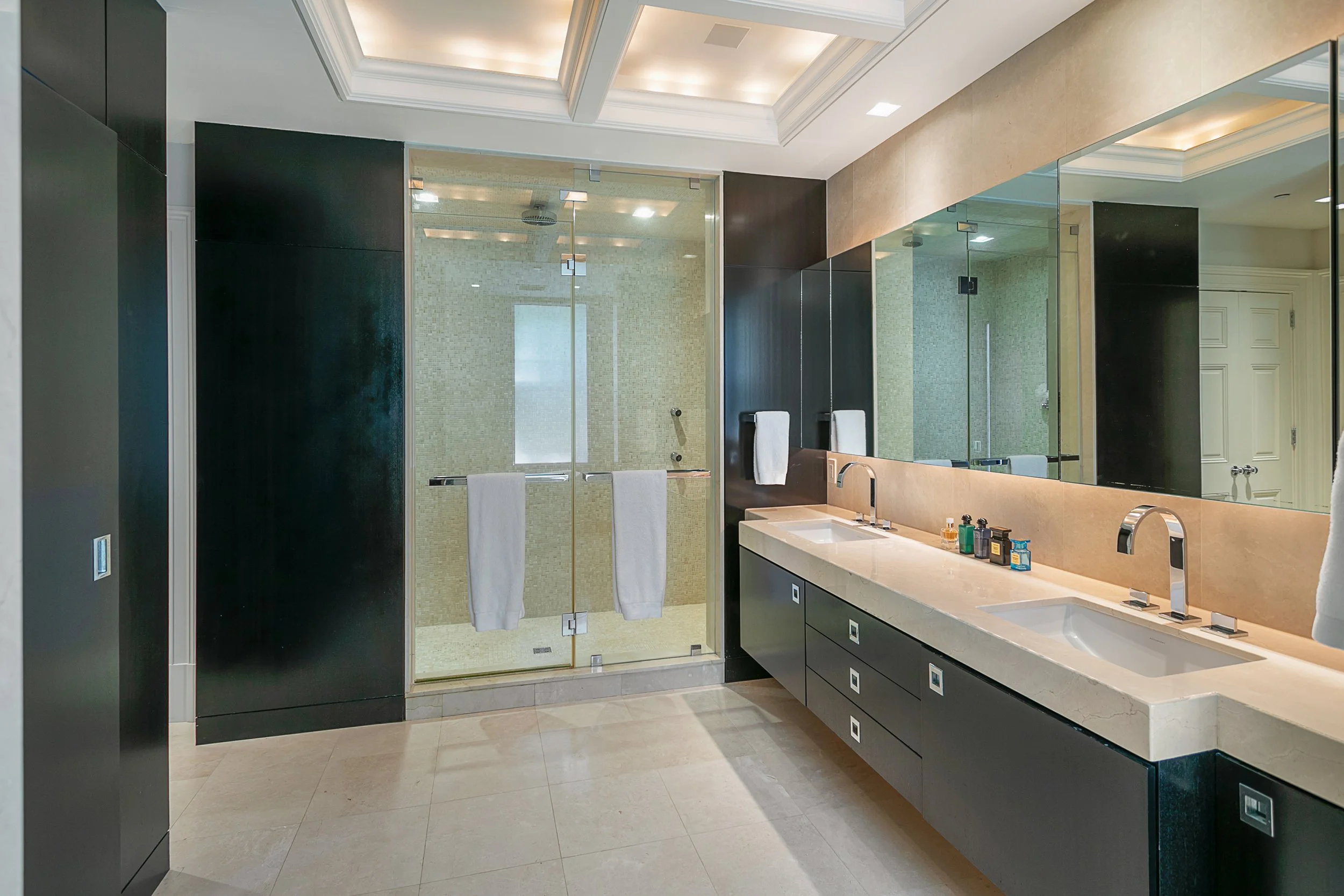 The main level is privately set above the street and features an open, flowing layout, perfect for entertaining. The gracious foyer has beautiful moldings and is lit by a lovely transom window above the front door. It leads to the elegant formal living room, which is complemented by an exquisite marble gas fireplaces, high ceilings, and elegant moldings. There is also an office with a gas fireplace on this floor. The chef’s kitchen has an attractive coffered ceiling, radiant floor heating, a large center island, custom cabinetry, and top-of-the-line stainless steel appliances. The kitchen opens to the dining room, which is enhanced with floor to ceiling windows and doors to the dining terrace and private gardens. There is the added convenience of a powder room and large mudroom with abundant storage and a secondary refrigerator on this floor.