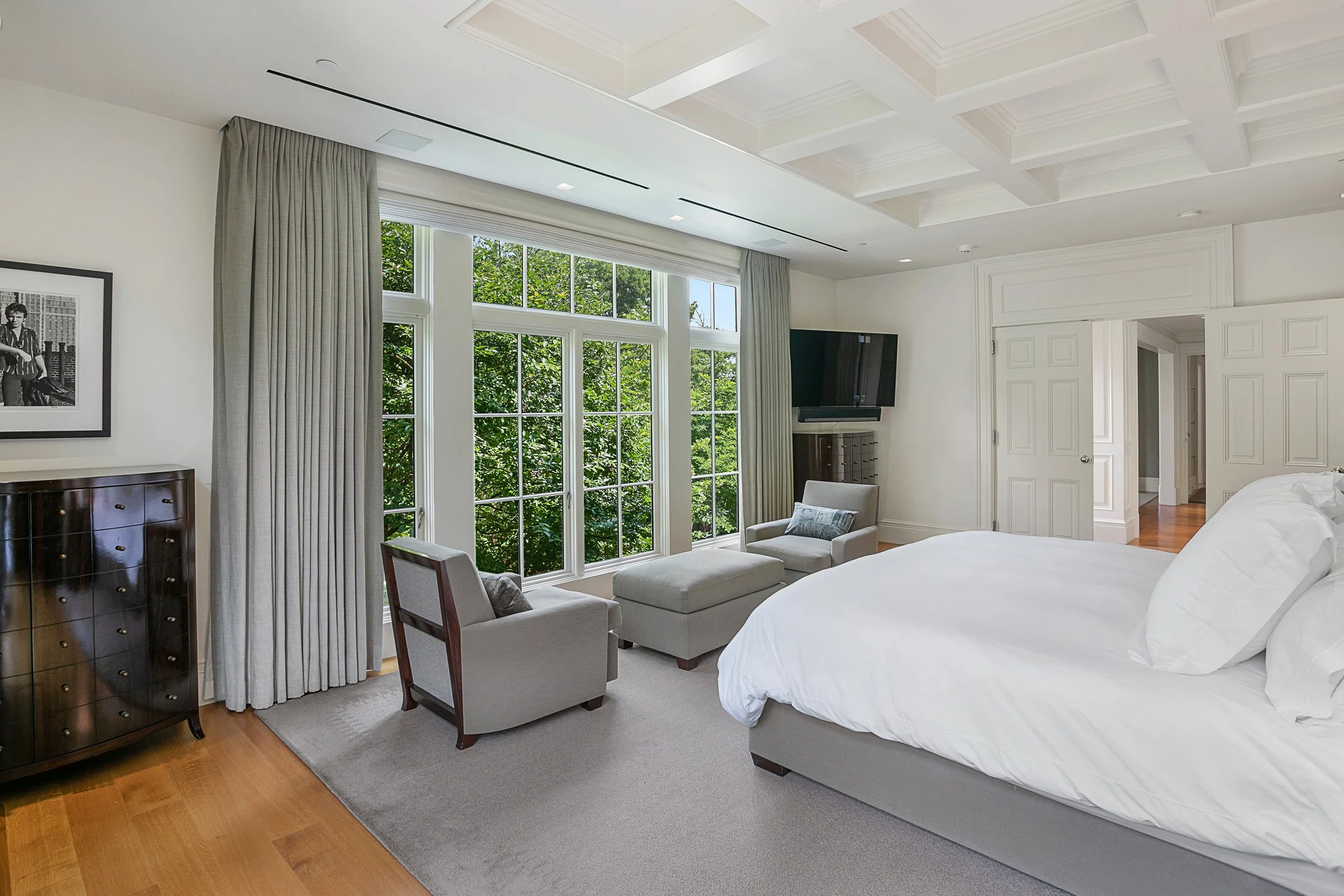 The stunning original staircase leads to the generous second level, which is flooded with sunlight from an original oversized window with dentil moldings and columns. The luxurious primary suite, which is on its own zone for heating and cooling, encompasses over half of the second floor and is flooded with streaming sunlight from walls of floor-to-ceiling windows. It has a beautiful coffered ceiling and an impressive walk-in dressing room with built-out closets. There is also a well-appointed en-suite bathroom with radiant heat floors, dual vanities, a frameless glass shower, and separate soaking tubs All bathrooms have Waterworks tile and the sinks and fixtures and Dornbracht. The primary suite also adjoins an attractive private office with a gas fireplace and a built-in desk and shelving. There are two additional bedrooms on this floor, both with fireplaces, that capture abundant sunlight and share a central bathroom. There is also a washer and dryer on this level for added convenience.