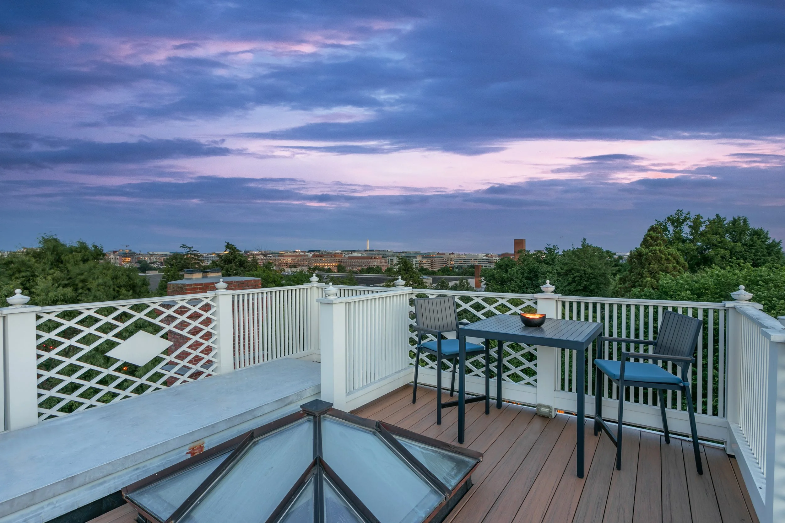 The third floor has three bedrooms, all with en-suite bathrooms. There is a spectacular roof deck off this floor, a wonderful space for entertaining, that provides panoramic views of DC and the Washington Monument. The lower level is beautifully finished and acts as a fully separate in-law suite. It is separately zoned and includes two bedrooms with private en-suite bathrooms, a full kitchen with a breakfast bar, and an additional laundry room. A gracious hallway leads to the extraordinary media room, wine cellar, kitchenette, and powder room. This space also provides an abundance of additional storage. The rear grounds are extensive and exceptionally private. The grounds are exceptional for entertaining featuring mature trees, an al fresco dining terrace, professionally landscaped gardens, and a wonderful entertaining terrace with a built-in water feature. There is also a wonderful pool-sized flat yard and a rarely available parking pad with space for 4 cars. The residence is within close walking distance to neighborhood favorite restaurants, shops, and parks.